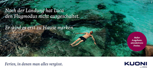 Die Zürcher Werbeagentur Wirz hat für Kuoni eine dem Zeitgeist entsprechende Kampagne aufgebaut. Claudia Herkert, Marketingverantwortliche von Kuoni, erklärt, man spreche mit einem Augenzwinkern gesellschaftliche Trends an. Allen voran die «Always on»-Mentalität. «Wir zeigen Situationen, in denen man sich selbst wiedererkennt», so Herkert.